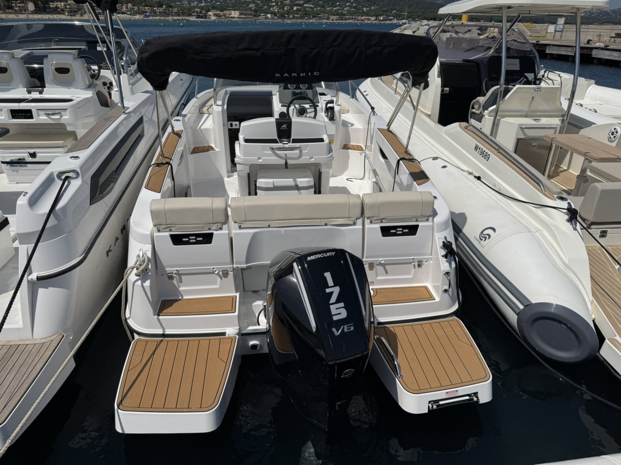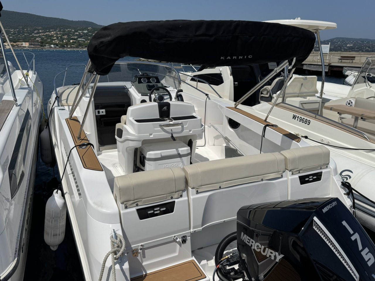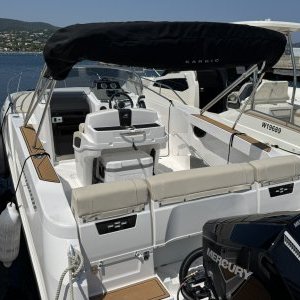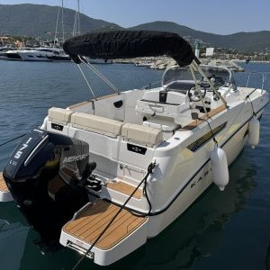 Equipé d’un moteur 175cv 4 tps, le bateau a un aménagement extérieur en U avec coussin et extension afin de faire un grand bain de soleil AR, bain de soleil AV, leaning post avec évier , douchette. Vous trouverez une table ainsi qu’une glacière igloo de 54 L .2 plateformes de bain avec échelle revêtement en seadeck sur la plateforme et plats bords, un grand bimini avec armature inox . une direction hydraulique., un guindeau électrique, batterie et coupe batterie, un poste radio avec 2 Haut parleurs, une cabine avec un couchage 2 personnes.