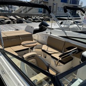 Ce bateau est équipé d’un guindeau électrique, d’un beau bain de soleil avant modulable, d’un grand taud de soleil, d’une table pique nique en teck, d’une douchette, d’un poste radio avec HP, d’un frigo sous coffre, d’un bain de soleil arrière + une méridienne de cockpit transformable, d’une belle plateforme de bain avec une partie submersible manuellement