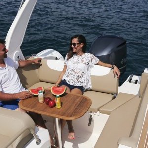 Ce bateau est équipé en plus du bain de soleil avant, d’un carre déjeuné arrière couvert par un taud de soleil de belle plateforme de bain avec échelle, d’une douchette, d’un GPS sondeur, de commande électrique, d’une direction hydraulique et d’un guideau électrique.