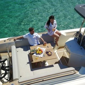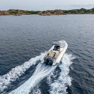 Cette version 2025 est équipé de deux moteurs YAMAHA 300 CV nouveau V6 avec direction électrique et joystick de manœuvre, Un GPS sondeur avec pilote automatique, un grand frigo de cockpit avec évier, Un T-Top fixe avec en extension une grande toile de taud avec 2 piquet Carbon,