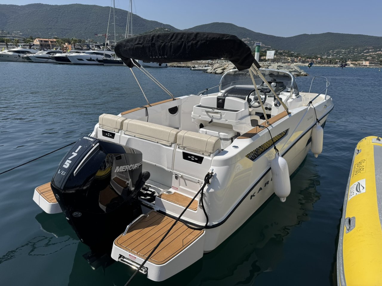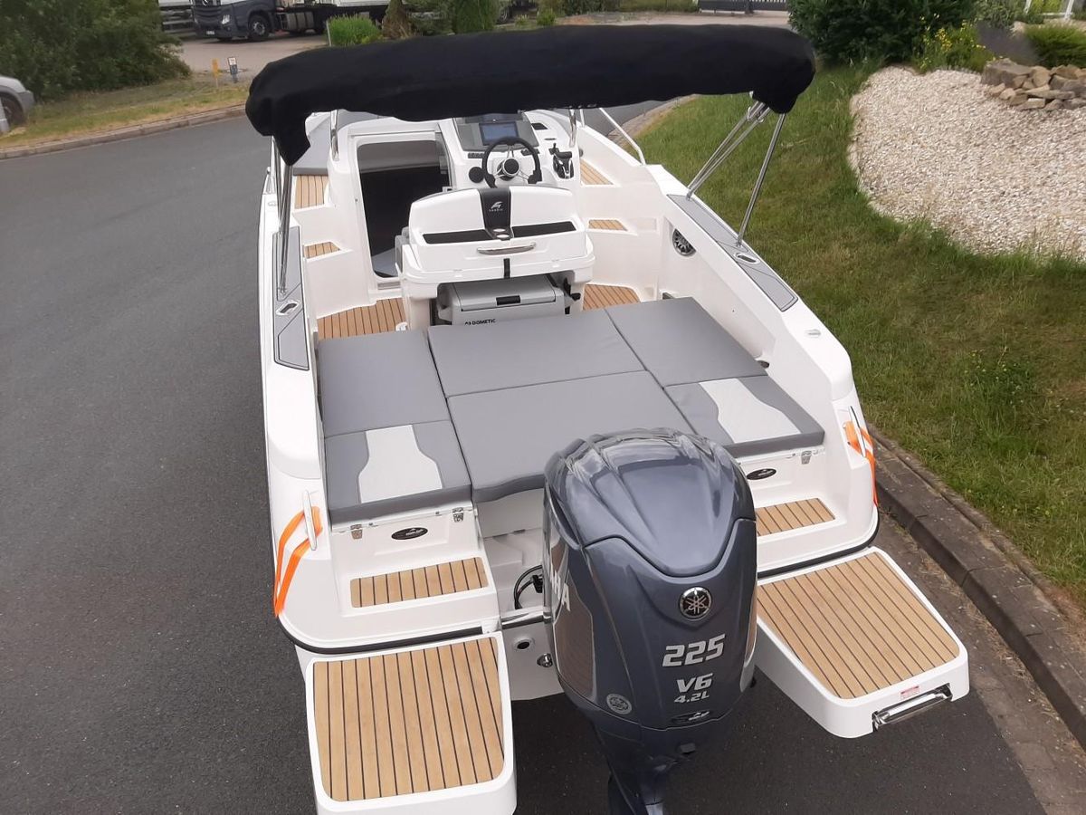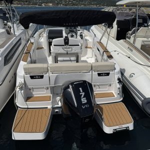 Equipé d’un moteur 175cv 4 tps, le bateau a un aménagement extérieur en U avec coussin et extension afin de faire un grand bain de soleil AR, bain de soleil AV, leaning post avec évier , douchette. Vous trouverez une table ainsi qu’une glacière igloo de 54 L .2 plateformes de bain avec échelle revêtement en seadeck sur la plateforme et plats bords, un grand bimini avec armature inox . une direction hydraulique., un guindeau électrique, batterie et coupe batterie, un poste radio avec 2 Haut parleurs, une cabine avec un couchage 2 personnes.